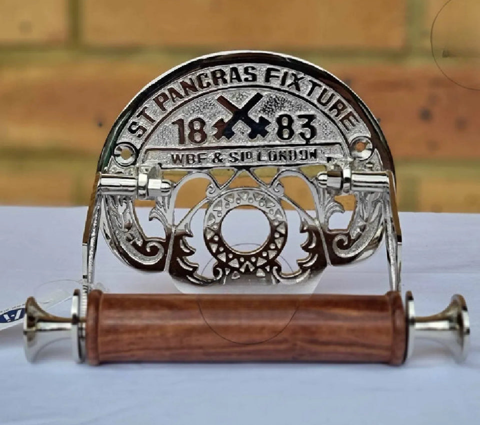 Embossed wall mounted toilet loo roll holder. A fabulous metal loo roll holder made from nickle. This piece is based on a traditional Victorian design. A brilliant way to add vintage detail to the bathroom or downstairs loo. The lovely wooden holder sits into the hooks for easy change of roll Easy to hang using the two screw holes  Measurements: Base: 19cm wide (14cm at base) x 15cm high