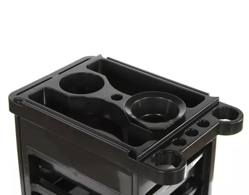 The Classic Salon Trolley has been designed for use in busy hairdressing salons. Also useful for home beauty storage or a home salon, this sturdy trolley has 5 trays to store all your salon products in, which can be accessed from both the front and back of the trolley for your convenience. The top of the trolley has been designed to function as a colouring tray, with a removable colour mixing bowl, plenty of room for putting aside brushes, combs and clips etc, and 2 hairdryer holders. With its strong wheels and convenient handle, this black hairdressing trolley is made of polypropylene, which makes it a lightweight yet durable trolley table that can be wheeled around salons effortlessly, making it very user-friendly. The Classic Salon Trolley would look good in any salon, and being black in colour, it would fit any stylish salon interior. Buy the Classic Salon Trolley today whilst stocks last!