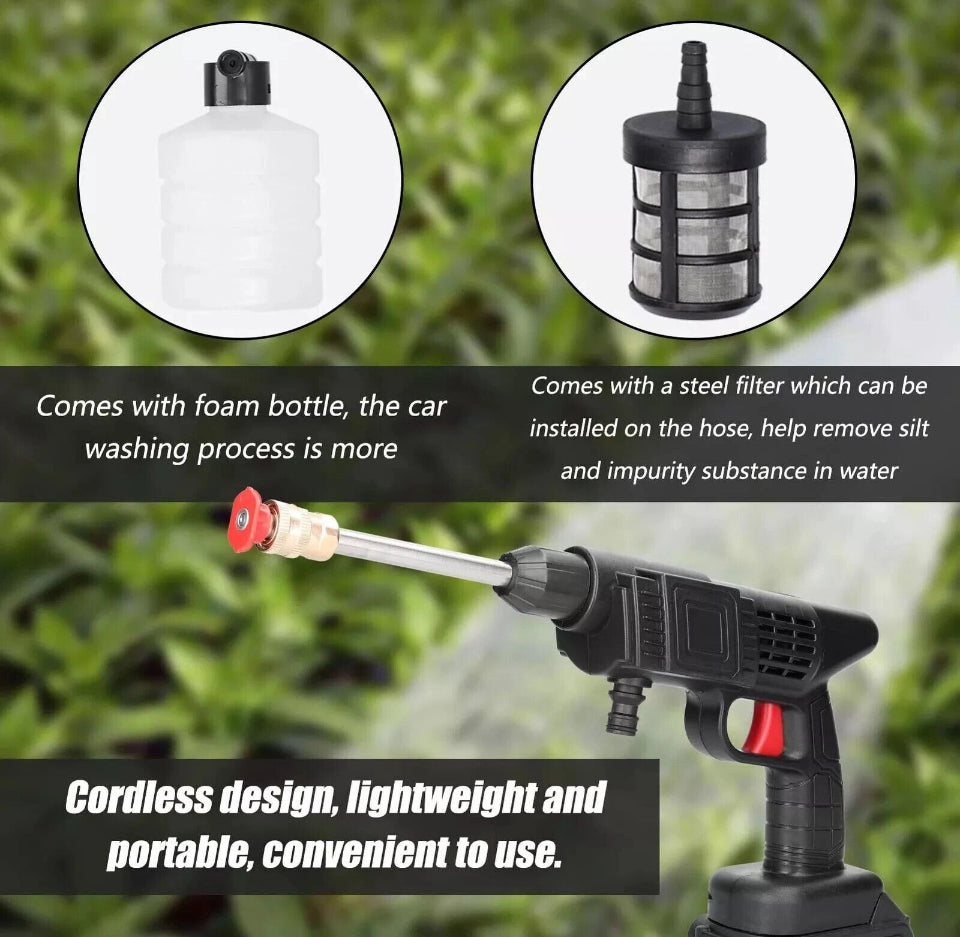 In addition, we also provide a nozzle with detergent container (approx.350ml), which can be used for daily cleaning. Fast foaming, fine and uniform foam, easy to wash the car. Compared with traditional pressure washing machines, our cordless power washer is lightweight and more portable.