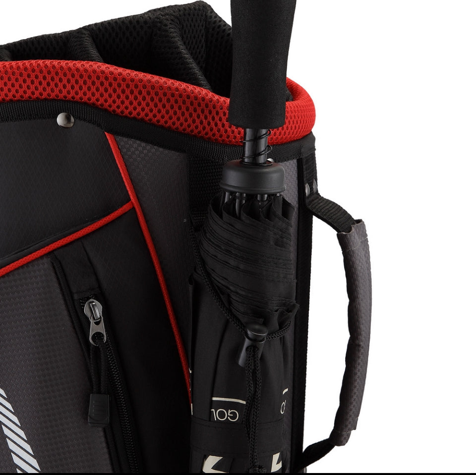 This golf trolley bag features 14 club dividers to keep everything organised, as well as an external umbrella holder.