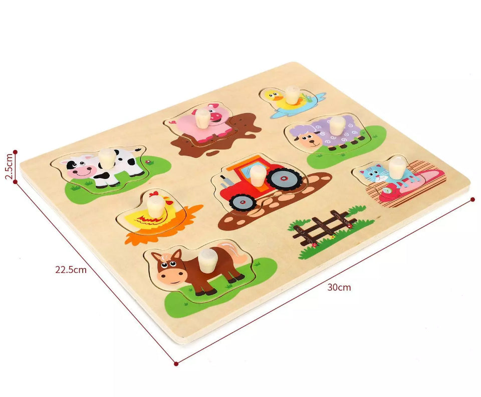SET INCLUDES: Peg puzzle includes 1 Cow, 1 Pig, 1 Duck, 1 Chicken, 1 Sheep, 1 Horse, a cat, and a Tractor. Product Dimension: 30cm X 25.8cm