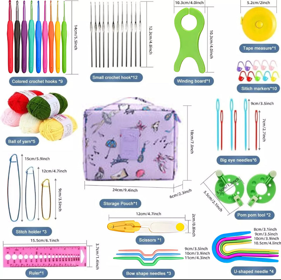 [Crochet Beginner's Kit] This Crochet kit includes 79 different knitting tools, 30 small pins, 3 aluminum pins, 12 lace crochets, 3 fried dough twist needles, 6 sewing needles, 2 ball makers, 1 safety scissors, 4 curved needles, 1 fish shaped winding board, 1 tape measure, 1 ruler, 5 wool, 9 color crochets, and 1 receiving bag. The whole Crochet kit meets your basic manual knitting needs.